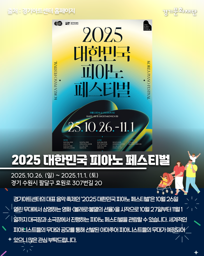 경기아트센터의 대표 음악 축제인 ‘2025 대한민국 피아노 페스티벌’은 10월 26일 열린 무대에서 상영하는 영화 <볼레로:불멸의 선율>을 시작으로 10월 27일부터 11월 1일까지 대극장과 소극장에서 진행하는 피아노 페스티벌을 관람할 수 있습니다. 세계적인 피아니스트들의 무대와 공모를 통해 선발된 아마추어 피아니스트들의 무대가 예정되어 있으니 많은 관심 부탁드립니다.