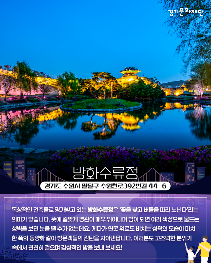 독창적인 건축물로 평가받고 있는 방화수류정은 ‘꽃을 찾고 버들을 따라 노닌다’라는 의미가 있습니다. 뜻에 걸맞게 경관이 매우 뛰어나며 밤이 되면 여러 색상으로 물드는 성벽을 보면 눈을 뗄 수가 없는데요. 게다가 연못 위로도 비치는 성곽의 모습이 마치 한 폭의 동양화 같아 방문객들의 감탄을 자아낸답니다. 여러분도 고즈넉한 분위기 속에서 천천히 걸으며 감성적인 밤을 보내 보세요!