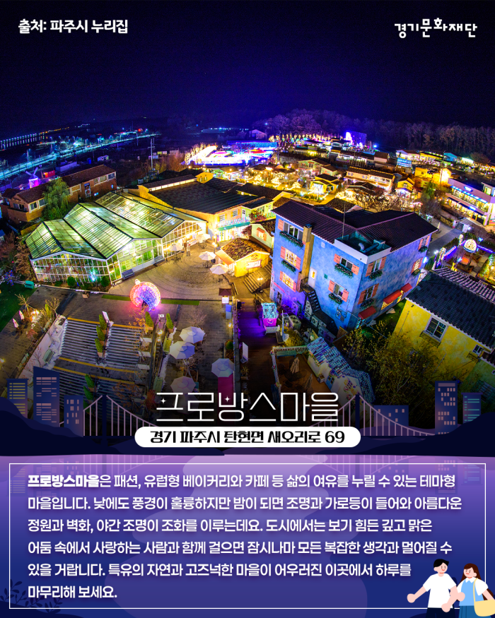 프로방스마을은 패션, 유럽형 베이커리와 카페 등 삶의 여유를 누릴 수 있는 테마형 마을입니다. 낮에도 풍경이 훌륭하지만 밤이 되면 조명과 가로등이 들어와 아름다운 정원과 벽화, 야간 조명이 조화를 이루는데요. 도시에서는 보기 힘든 깊고 맑은 어둠 속에서 사랑하는 사람과 함께 걸으면 잠시나마 모든 복잡한 생각과 멀어질 수 있을 거랍니다. 특유의 자연과 고즈넉한 마을이 어우러진 이곳에서 하루를 마무리해 보세요.