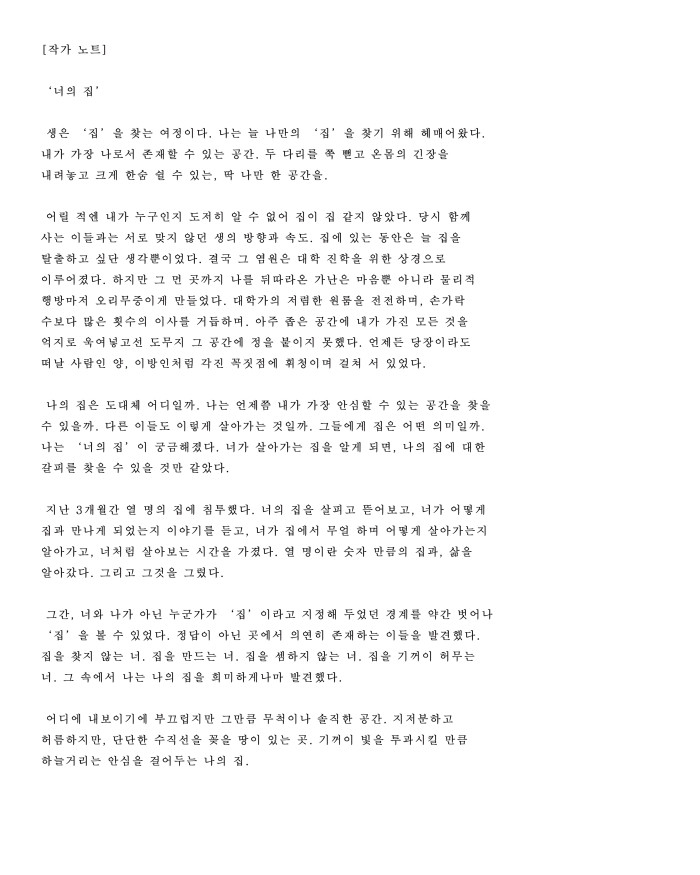그간, 너와 나가 아닌 누군가가 ‘집’이라고 지정해 두었던 경계를 약간 벗어나 ‘집’을 볼 수 있었다. 정답이 아닌 곳에서 의연히 존재하는 이들을 발견했다. 집을 찾지 않는 너. 집을 만드는 너. 집을 셈하지 않는 너. 집을 기꺼이 허무는 너. 그 속에서 나는 나의 집을 희미하게나마 발견했다.