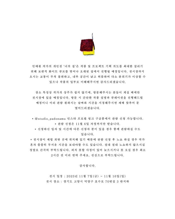 민예원 작가의 개인전 '너의 집'은 작품 및 프로젝트 기획 의도를 최대한 살리기 위해 보편적 화이트 큐브를 벗어나 오래된 집에서 진행될 예정입니다. 전시장까지 오시는 교통이 무척 불편하고, 내부 공간이 낡고 허름하여 다소 분위기가 이상할 수 있으나 작품의 일부로 이해해주시면 감사드리겠습니다.