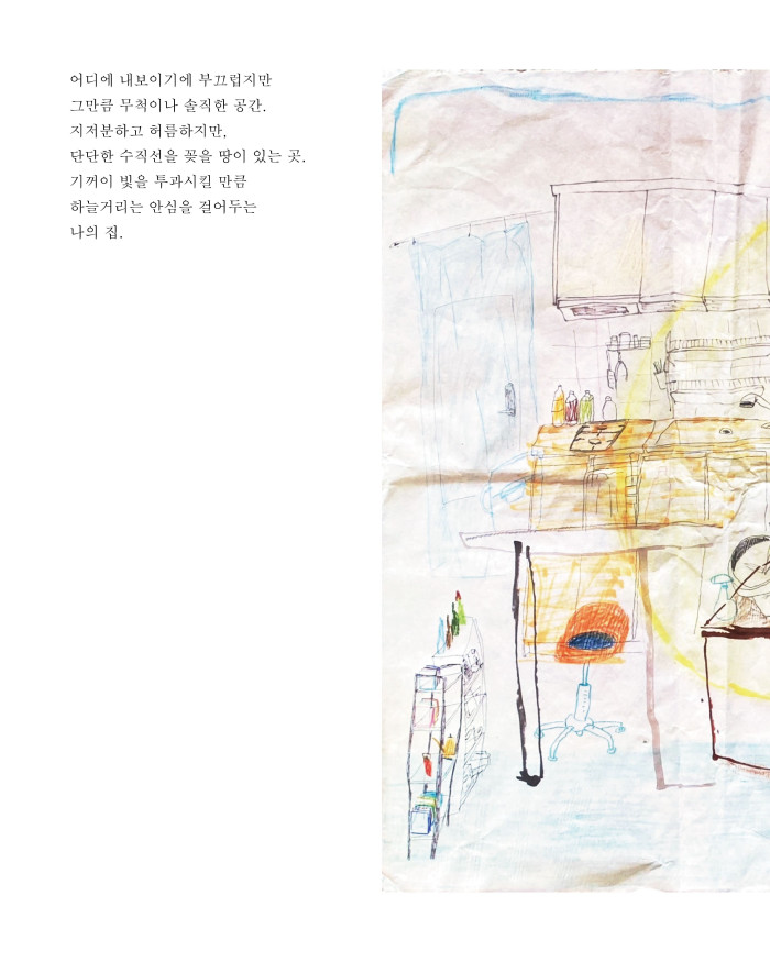 어디에 내보이기에 부끄럽지만 그만큼 무척이나 솔직한 공간. 지저분하고 허름하지만, 단단한 수직선을 꽂을 땅이 있는 곳. 기꺼이 빛을 투과시킬 만큼 하늘거리는 안심을 걸어두는 나의 집.