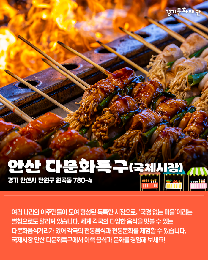 여러 나라의 이주민들이 모여 형성된 독특한 시장으로, ‘국경 없는 마을’이라는 별칭으로도 알려져 있습니다. 세계 각국의 다양한 음식을 맛볼 수 있는 다문화음식거리가 있어 각국의 전통음식과 전통문화를 체험할 수 있습니다. 국제시장 안산 다문화특구에서 이색 음식과 문화를 경험해 보세요!