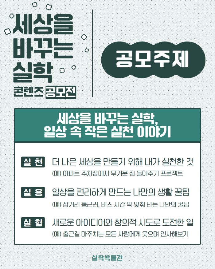 한편 실학박물관은 지난해부터 대중이 실학이라는 학문을 새롭게 인식하고 일상 속 문화로 자리매김할 수 있도록 다양한 시도를 펼치고 있다. 이번 공모전 역시 실학박물관이 추진 중인 작은 실험 지원사업 〈실·실·실 프로젝트〉의 연장선에서 진행된다.