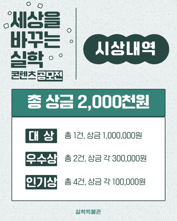 출품작은 전문가 심사와 온라인 공개투표를 거쳐 선정되며, 대상(1,000,000원), 우수상(300,000원, 2명), 인기상(100,000원, 4명) 등 총상금 200만원 규모로 시상한다. 선정된 우수 콘텐츠는 공식 SNS에 게시되고, 〈실·실·실 프로젝트〉 성과전시와 연계하여 상영된다.
