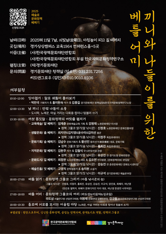 경기문화재단(대표이사 유정주)는 (사)한국광역문화재단연합회와 함께 공동주최로 “2025 예술로 문화정책 베짜기”를 오는 11월 7일 금요일, 경기상상캠퍼스 교육1964동 전관에서 오전 10시부터 오후 7시 30분까지 개최한다.