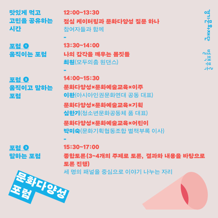 ‘움직이고 말하는 문화다양성 포럼’은 크게 네트워킹과 포럼으로 나누어 진행한다. 네트워킹은 점심과 함께 고민을 나누는 시간으로 마련하였으며, 이후 세 가지 포럼이 순차적으로 이어진다. 첫 번째 ‘움직이는 포럼’에서 참여자는 장애인 당사자들과 움직임, 춤으로 만나온 최원 강사(모두의춤 원댄스)와 함께 내 몸의 감각을 깨우는 시간을 가진다.