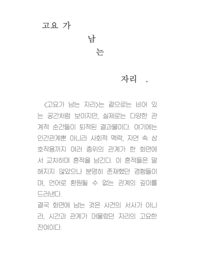 <고요가 남는 자리>는 겉으로는 비어 있는 공간처럼 보이지만, 실제로는 다양한 관계적 순간들이 퇴적된 결과물이다. 여기에는 인간관계뿐 아니라 사회적 맥락, 자연 속 상호작용까지 여러 층위의 관계가 한 화면에서 교차하며 흔적을 남긴다. 이 흔적들은 말해지지 않았으나 분명히 존재했던 경험들이며, 언어로 환원될 수 없는 관계의 깊이를 드러낸다.