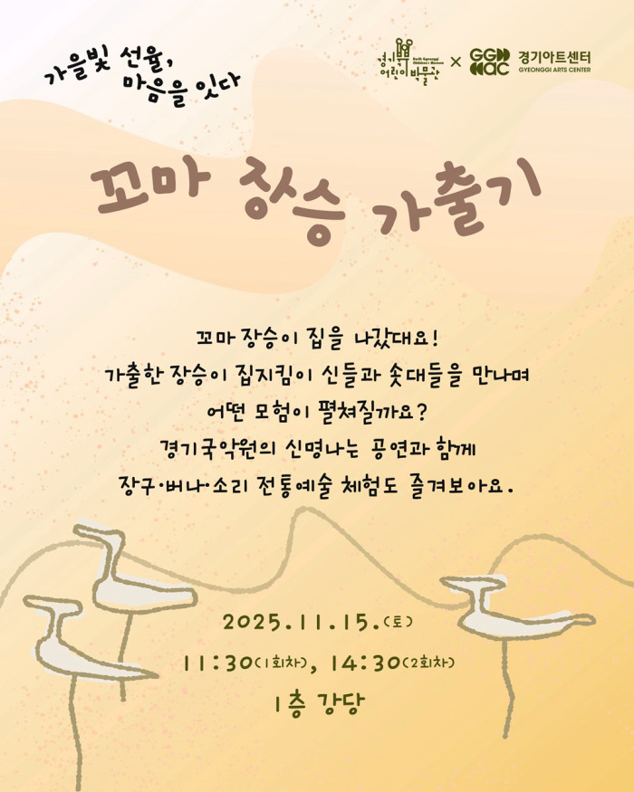 11월 15일(토)에 선보일 ‘꼬마 장승 가출기’는 경기아트센터 경기국악원과의 협업으로 마련된 국악 뮤지컬로 가출한 꼬마 장승이 집지킴이 신들과 장승, 솟대들을 만나며 펼치는 신나는 모험이 펼쳐진다. 공연 관람과 함께 장구·버나·소리 등 전통예술 체험도 즐길 수 있다. (11시 30분, 14시 30분, 총 2회)
