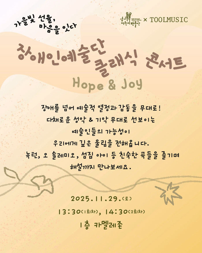 11월 29일(토), 마무리를 장식하는 장애인예술단 클래식콘서트 ‘Hope & Joy’는 장애를 넘어선 예술적 열정과 감동을 선보는 무대이다. 왼손 피아니스트 이훈의 피아노 연주와 다채로운 기악 및 성악 무대, 음악 해설로 관객들에게 깊은 울림을 전할 예정이다. (13시 30분, 14시 30분, 총 2회)