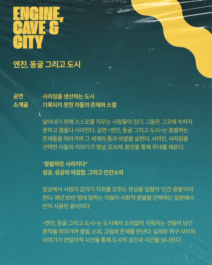 일상에서 사람이 갑자기 자취를 감추는 현상을 일컬어 ‘인간 증발’이라 한다. 매년 10만 명에 달하는 이들이 사회에서 증발을 선택하는 일본에서 먼저 사용된 용어이다. 공연 <엔진, 동굴 그리고 도시>는 도시에서 소리없이 지워지는 것들이 남긴 흔적을 따라가며 결핍, 소외, 고립의 존재를 만난다. 실제와 허구 사이의 이야기가 관찰자적 시선을 통해 도시의 공간과 시간을 넘나든다.