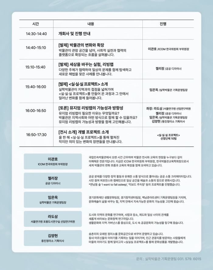 이어 실학박물관 임은옥 기획운영팀장이 〈실·실·실 프로젝트〉의 운영 과정과 성과를 발표하며, 서울연구원 라도삼 선임연구위원이 이끄는 토론으로 뮤지엄 리빙랩의 가능성과 방향성을 모색해본다. 마지막 순서로는 10개 선정단체가 개별 프로젝트를 발표하며 현장감 있는 성과를 공유한다.