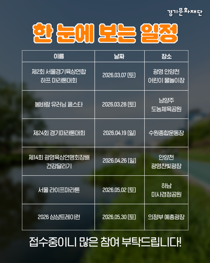 그래서 경기도 안에서 부담 없이 달리기 좋은 러닝 장소들과 지금 접수 해야 할 마라톤 일정까지 경기문화재단에서 정리했습니다!