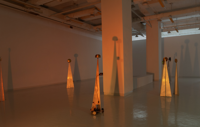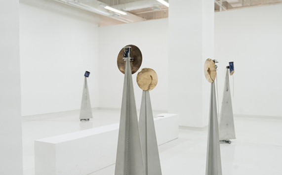 슬기로운 기계종 / Machina Sapiens ● 키네틱 조형과 기계공학을 전공하며 예술과 공학의 경계를 가로질러 온 작가가 창조한 '슬기로운 기계종‘은 스스로 감각하고 존재를 증명하는 능동적 주체다. 〈원형의 원〉에서 기계들은 각자의 자리에서 반복적으로 소리를 내며 인류의 기원적 의례를 연상시키고, 〈기원〉의 기계종들은 스프링을 통해 소리를 내는 동시에 주위의 전자기장을 감각하며 자신만의 환경을 구축한다.