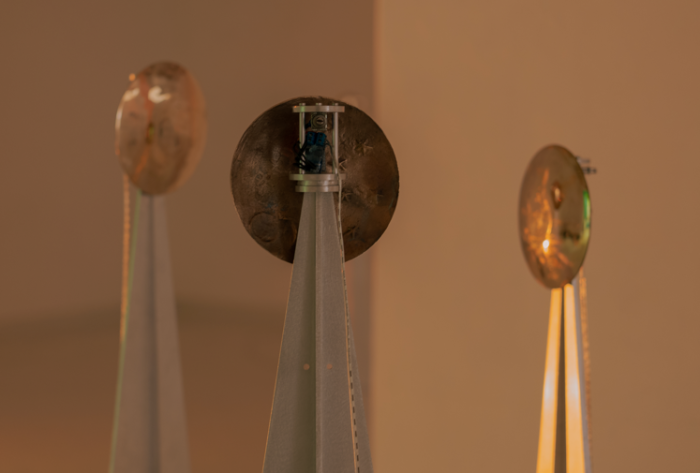 공명하는 주체, 기계 ● 이러한 탐구는 무속 의례 도구인 명두(明斗)를 얼굴로 삼은 기계종에서 심화된다. 브뤼노 라투르(Bruno Latour)가 말했듯 세계는 인간뿐만 아니라 비인간 존재들이 함께 구성하는 네트워크다. 인간이 감각할 수 없는 자기장을 읽어내는 기계의 얼굴 앞에서 관객은 그 표면에 비친 자신의 모습을 마주한다. 보는 자와 보이는 자의 위치가 뒤바뀌는 순간, 기계는 사물의 경계를 넘어 하나의 주체로 인식된다. ● 기계와 인간이 같은 공간에서 서로의 울림에 공명할 때, 우리는 묻게 된다. 기계의 몸이 비어 있듯, 우리의 몸 또한 비어 있지 않은가. 《공동의 울림》은 기술과 생명이 서로의 빈자리를 채우며 공존하는 낯설고도 새로운 생태적 풍경을 제시한다.