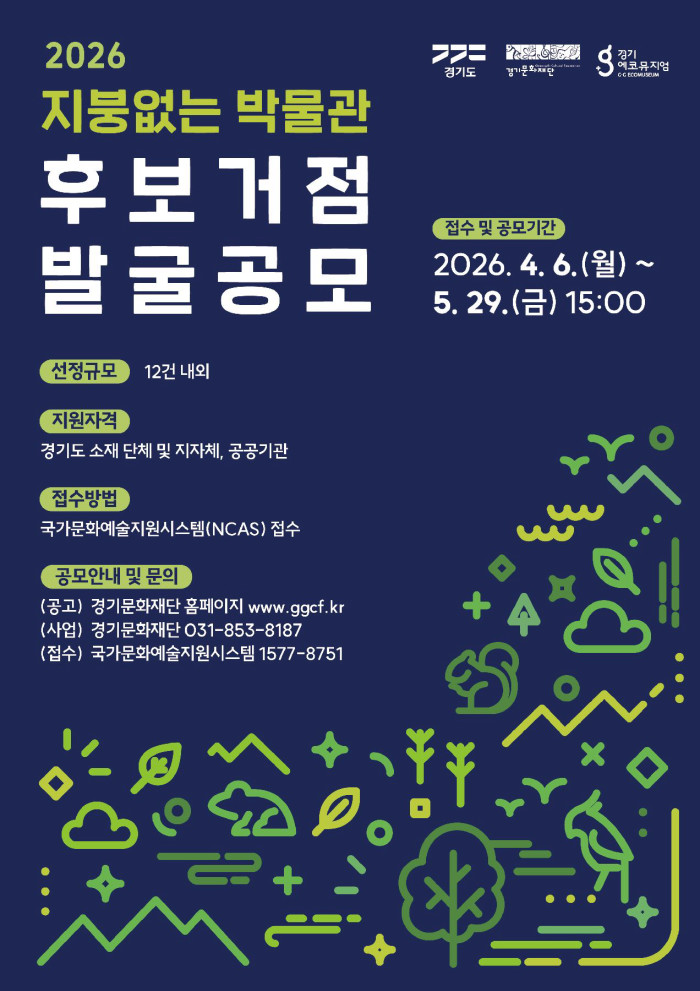 공모 접수는 오는 5월 29일(금) 15시까지 국가문화예술지원시스템(NCAS)을 통해 온라인으로 진행된다. 자세한 공고 내용은 경기문화재단 누리집(www.ggcf.kr)에서 확인할 수 있다.